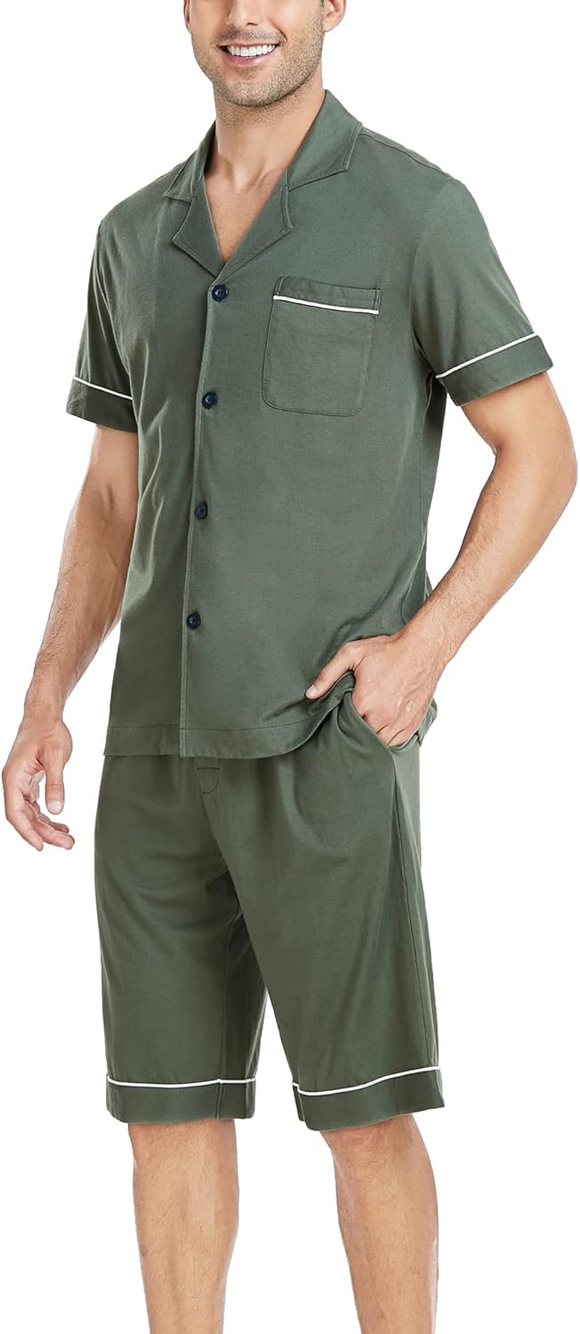 Men100% Cotton Short Sleeve Pajama Sets Button Down Notched Collar Sleepwear Soft Lounge Pjs with Pockets